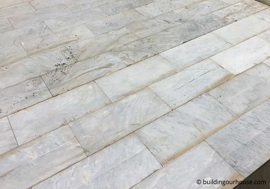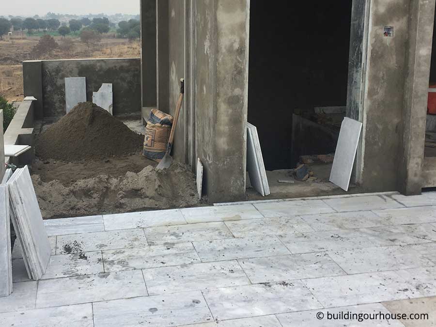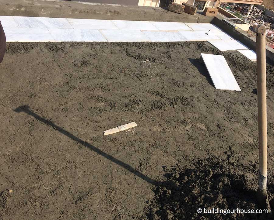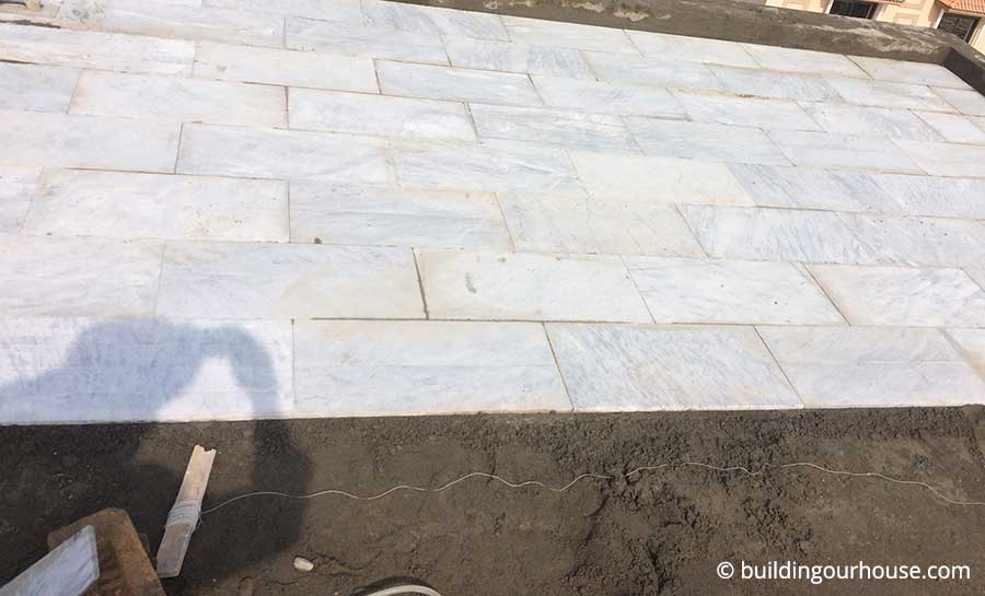 Before started to work on installing marble, we need to level the floor. This step is specially important as you want all the rain water to move towards drain pipe as soon as possible. Rain water must not be allowed to stay on the floor and make small ponds. This way, the water will seep into the floor, going down in the walls and ruining the whole structure.